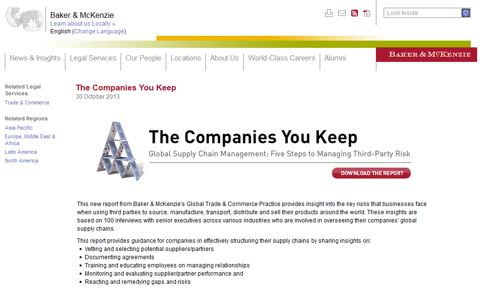Global Supply Chain Management: Five Steps to Managing Third-Party Risks This new report from Baker & McKenzie’s Global Trade & Commerce Practice provides insight into